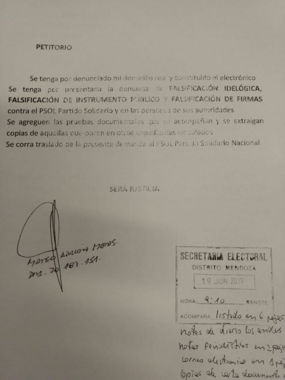 -Él cumple la doble función del presidente del partido solidario de Mendoza -yo era vicepresidente y él actualmente sigue siendo presidente- y aparte gerente regional del banco Credicoop. Maneja prácticamente el 25% de todo el banco en el país. Cuando yo le comento estas y otras irregularidades, nunca imaginé que sería despedido de mi cargo. Yo fui uno de los afectados, porque a mí también me falsificaron la firma.
