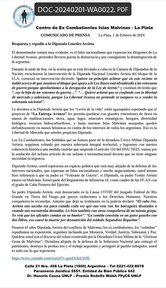 El padre de la polémica diputada nacional, Lourdes Arrieta, está denunciado por ser extremadamente cruel con los soldados que tuvo a cargo durante la guerra en las Islas Malvinas, según recordó el Centro de Ex-Combatientes de La Plata en una publicación de diario Memo.