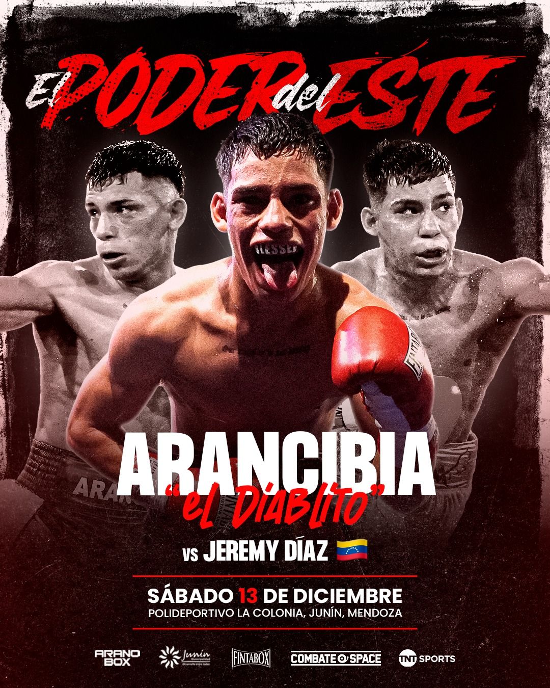 Por su parte, el lavallino Ángel “El Diablito” Arancibia (9-1-1, 6 KO) pondrá en juego su corona Sudamericana gallo frente al invicto y noqueador venezolano Jeremy “La Bala” Díaz (6-0-0, 6 KO) 💣, considerado hasta ahora el rival más exigente de la joven y ascendente carrera del mendocino .