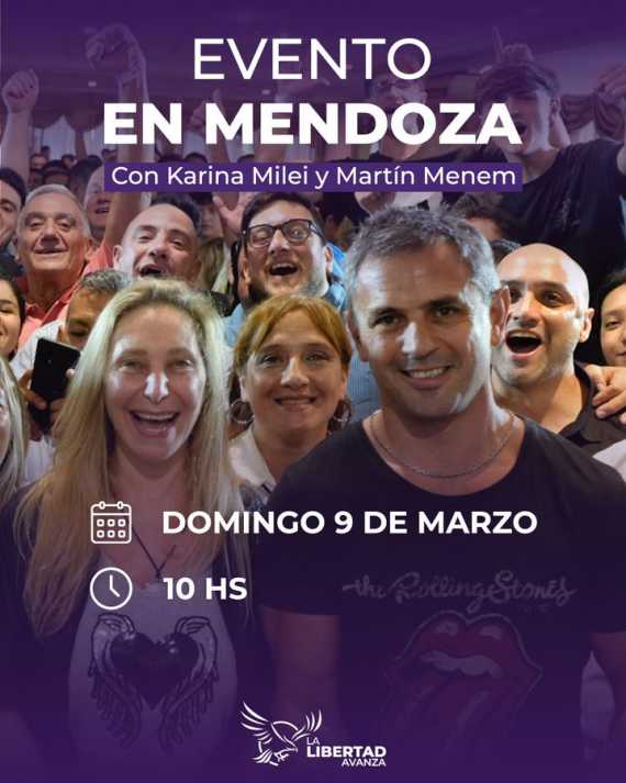Este acto será para lanzar oficialmente La Libertad Avanza en Mendoza y en las invitaciones personales tampoco se menciona la sede: “Queremos invitarte al evento de lanzamiento de La Libertad Avanza en Mendoza el domingo 9 de marzo. Te necesitamos para terminar con la casta que hundió a nuestro país durante décadas y sigue haciendo todo lo posible para detenernos. Acompañá a Karina Milei y otros referentes de La Libertad Avanza para seguir dando esta batalla. Tu presencia es fundamental para ayudarnos a que Argentina sea libre de una vez por todas“.