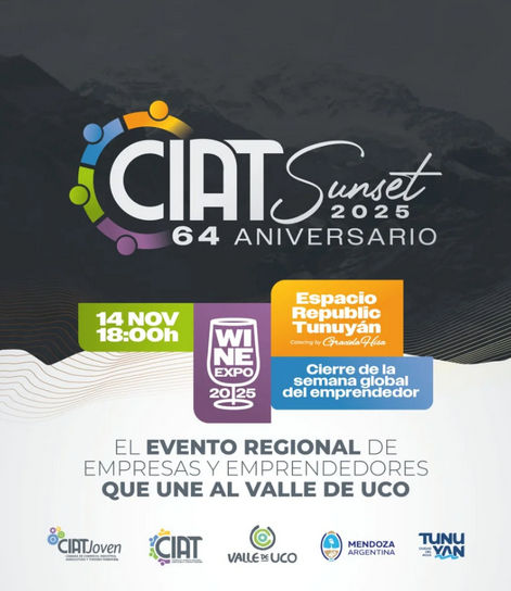 La Cámara de Comercio, Industria, Agricultura y Turismo de Tunuyán (CIAT) celebrará este viernes 14 sus 64 años de trayectoria con un nuevo sunset aniversario que reunirá a productores, empresarios, autoridades y referentes del Valle de Uco.