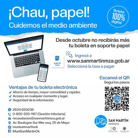 La comuna de General San Martín dejó de imprimir las boletas de tasas municipales y ya incorporó (a partir de este quinto bimestre del año), el cobro de tasas y servicios en un formato digital. Esta transformación permite a los vecinos recibir sus boletas a través de medios como correo electrónico o WhatsApp.