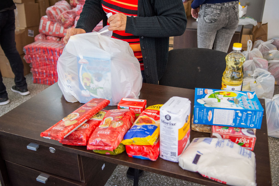 Trabajadores municipales preparan la tercera entrega de bolsas que se solventa con fondos municipales e incluye un bolsón de alimentos, otro con elementos de limpieza y aseo personal y, en el caso de que la familia tenga hijos en edad escolar, también se entregó un bolso con útiles.