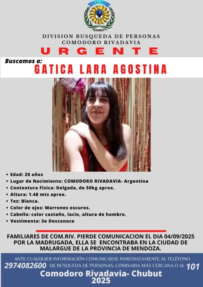 Una joven de 20 años, originaria de Comodoro Rivadavia, está desaparecida desde la madrugada del 4 de septiembre. Su nombre es Lara Agostina Gatica y fue vista por última vez en Malargüe. Desde ese momento, su familia no ha tenido noticias de ella y solicitan ayuda para encontrarla.