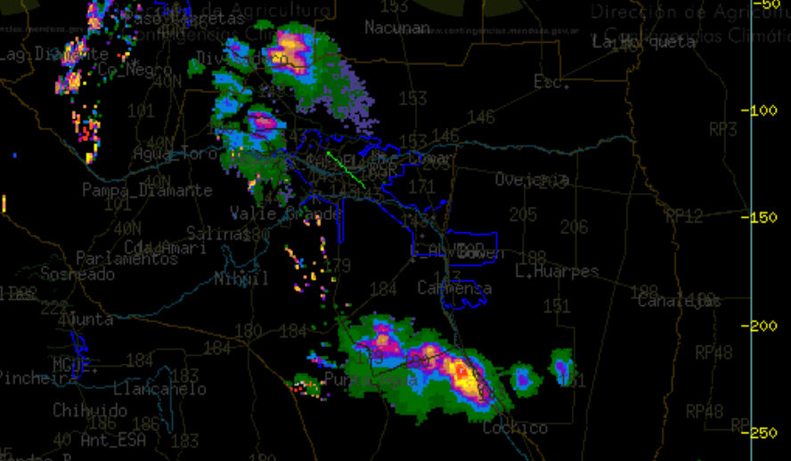 Una fuerte precipitación de granizo se registró cerca de las 14.40 en el sur del departamento de San Rafael, el primer punto de Mendoza alcanzado por la inestabilidad de este sábado. Allí se formaron dos superceldas graniceras, una de ellas al norte del distrito de Punta de Agua, donde el fenómeno comenzó alrededor de las 14.10.